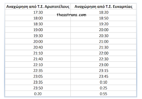 Όσον αφορά τα δρομολόγια, το 1ο είναι στις 17:30 από την Αριστοτέλους (πέταλο) με μέση συχνότητα την μισή ώρα και τελευταίο δρομολόγιο στις 00:20. Αντίστοιχα από τον τερματικό σταθμό Ευκαρπίας η γραμμή έχει πρώτο δρομολόγιο στις 18:20 και τελευταίο στις 00:50 με μέση συχνότητα τα 30 λεπτά