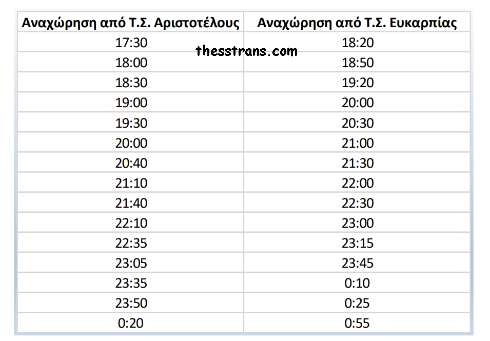 Όσον αφορά τα δρομολόγια, το 1ο είναι στις 17:30 από την Αριστοτέλους (πέταλο) με μέση συχνότητα την μισή ώρα και τελευταίο δρομολόγιο στις 00:20. Αντίστοιχα από τον τερματικό σταθμό Ευκαρπίας η γραμμή έχει πρώτο δρομολόγιο στις 18:20 και τελευταίο στις 00:50 με μέση συχνότητα τα 30 λεπτά